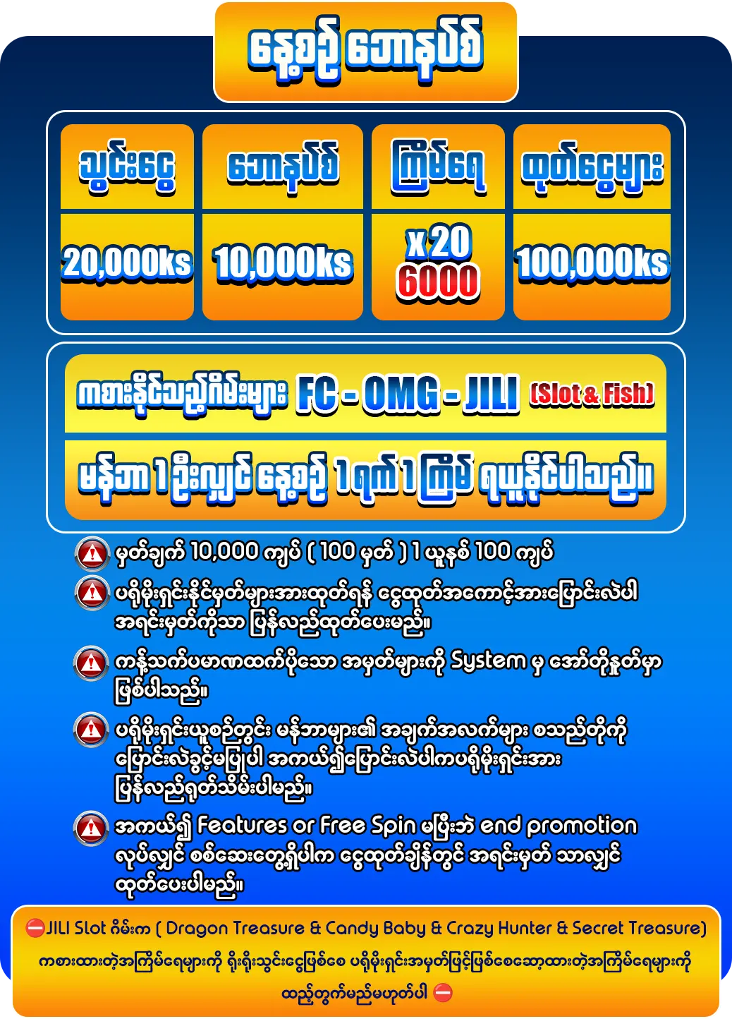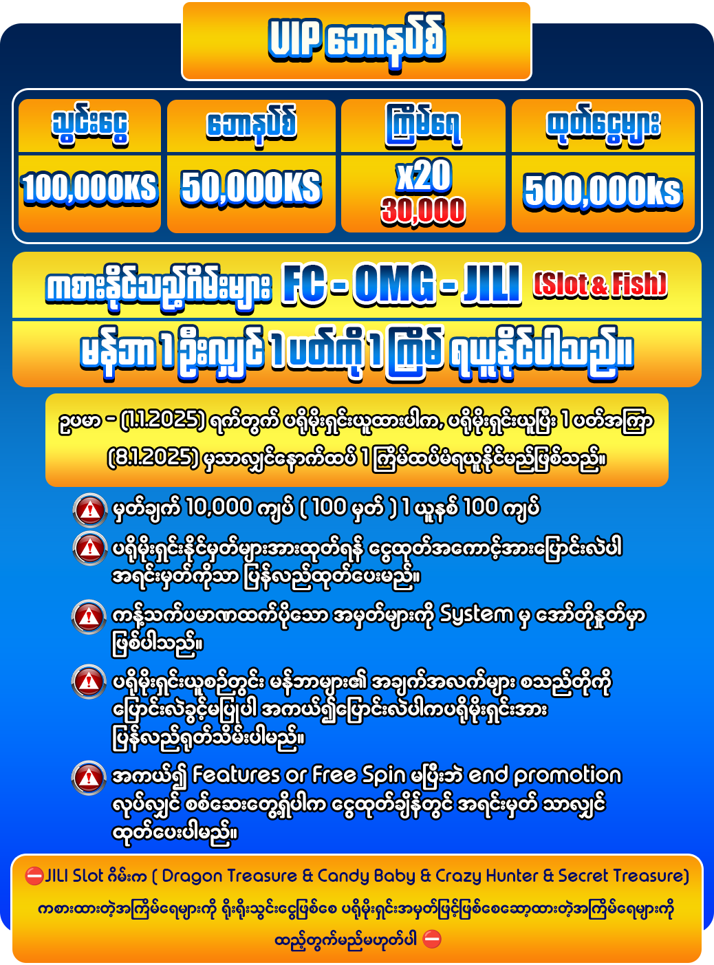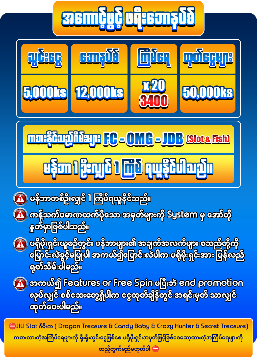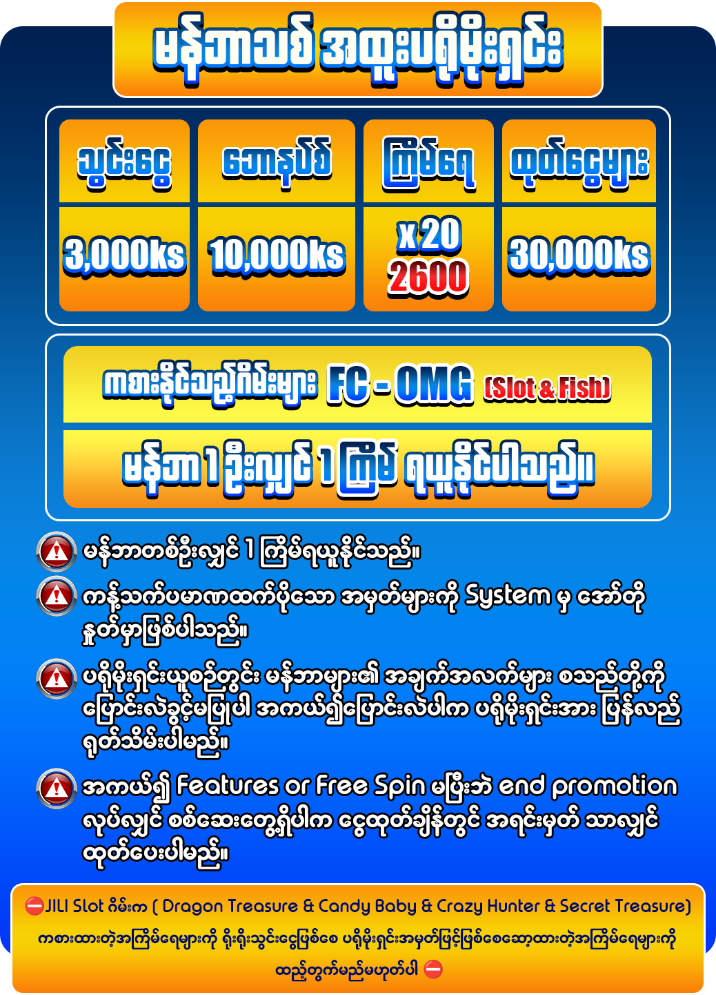 📌Promotion အမွတ္ႏွင့္ေဆာ့ထားေသာ Spin ( သို႔ ) Free Spin မ်ားကို ထည့္တြက္မည္မဟုတ္ပါ။ ( ေငြသြင္းေဆာ့ၿပီး အႏိုင္ရရွိမွသာအက်ဳံးဝင္ပါမည္ )