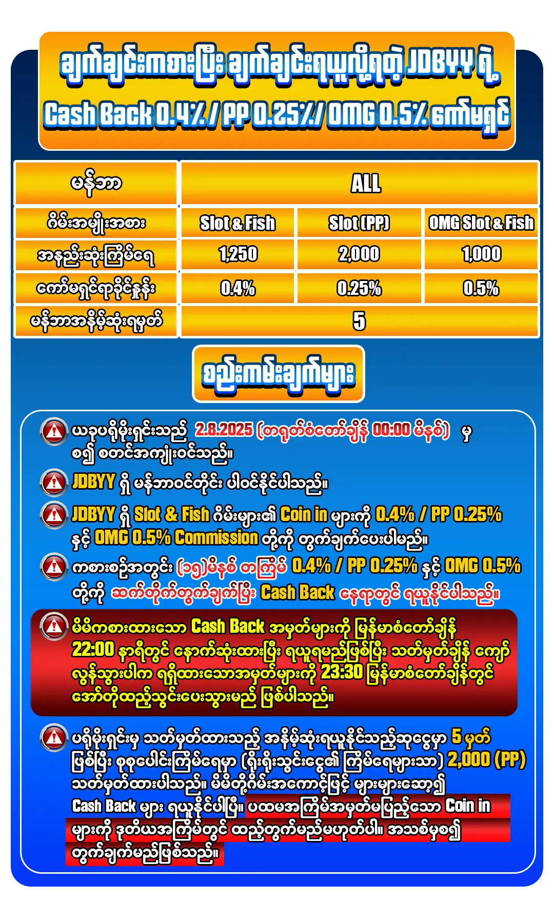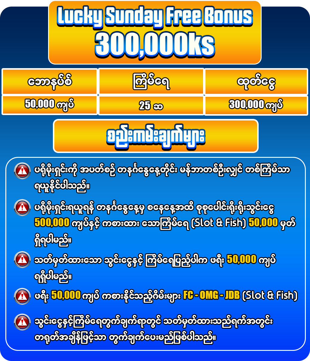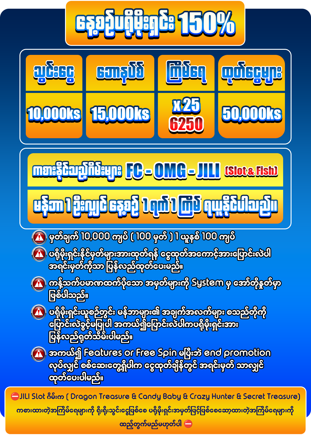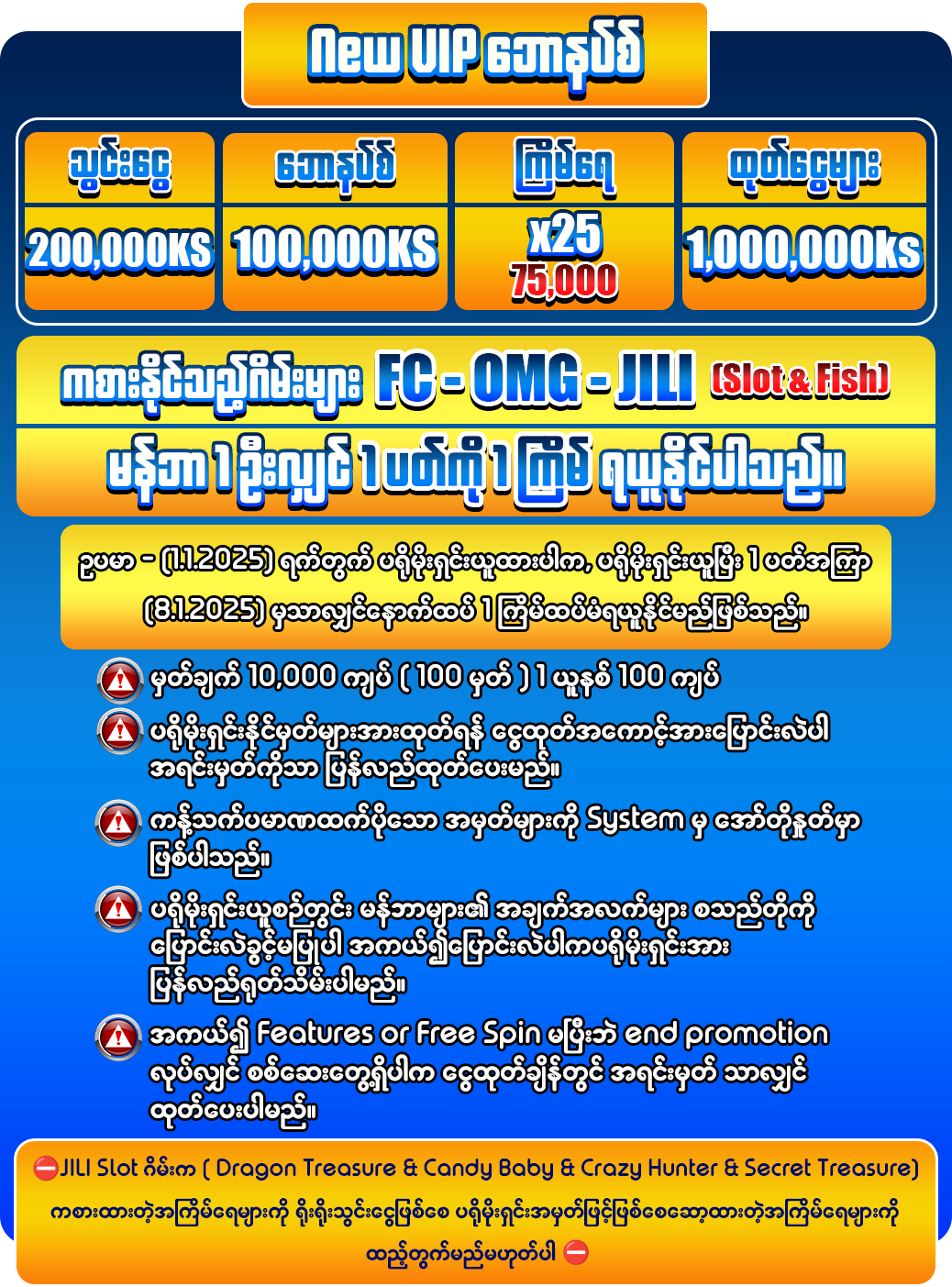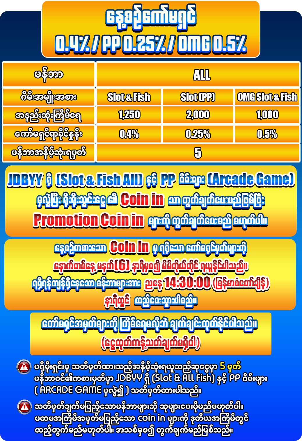 📌Promotion အမွတ္ႏွင့္ေဆာ့ထားေသာ Spin ( သို႔ ) Free Spin မ်ားကို ထည့္တြက္မည္မဟုတ္ပါ။ ( ေငြသြင္းေဆာ့ၿပီး အႏိုင္ရရွိမွသာအက်ဳံးဝင္ပါမည္ )